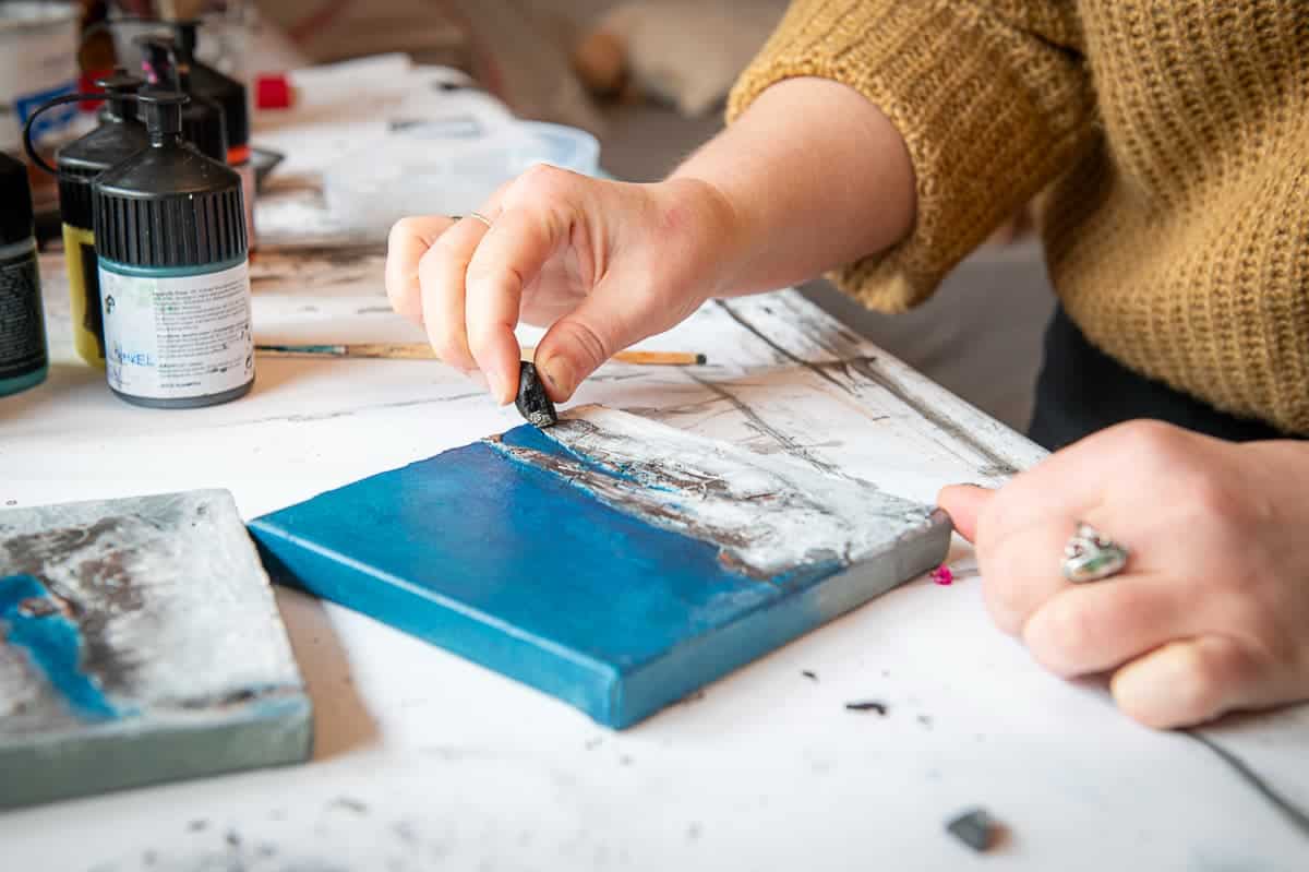 Zuerst entsteht die Struktur – sie kann aus Sumpfkalk, Marmormehl, Steinmehl, Champagnerkreide, Sand, Kaffeesatz, Eierschalen oder Papier bestehen. Dann beobachte ich, wohin mich die Leinwand führt, denn beim Trocknen entstehen oft ganz von selbst faszinierende Risse und Oberflächen.